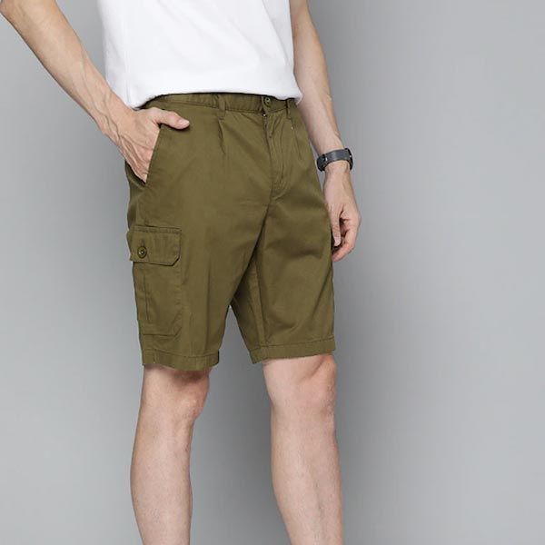 Olive green solid mid-rise cargo shorts, has 6 pockets, button closure
